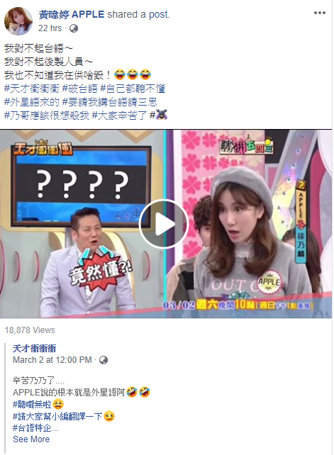 Apple的「破台語」,不僅讓乃哥猜得很吃力,也讓節目的字幕組後製得很辛苦。她昨(3)日晚上在臉書分享片段,寫著:「我對不起台語~我對不起後製人員,我也不知道我在供啥毀。」還笑說自己的台語根本是外星語,「乃哥應該很想殺我,大家辛苦了。」