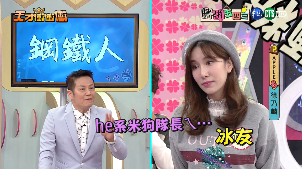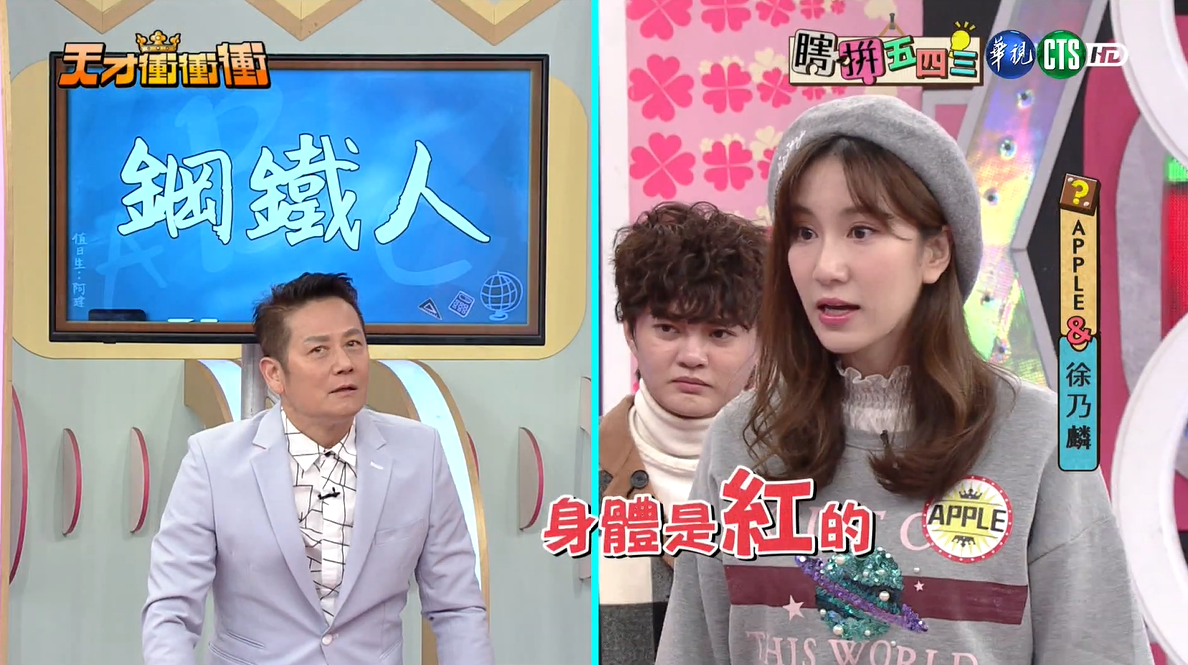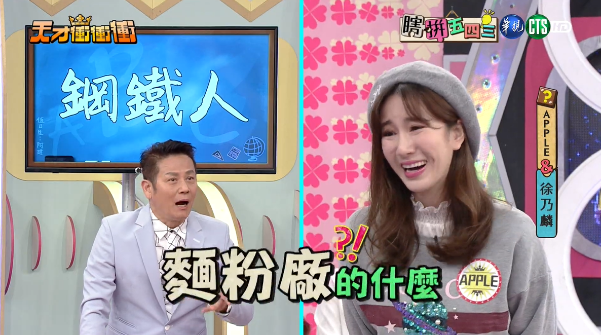 2日播出的《天才衝衝衝》,Apple在「瞎拚ABC」關卡和乃哥同一組,前兩分鐘用英文形容讓乃哥猜,後面1分鐘改用台語。當時題目是「鋼鐵人」,她用著非常不輪轉的台語說:「he系米狗隊長ㄟ冰友(美國隊長的朋友)」,乃哥有聽沒懂直說「麵粉廠的什麼?」瞬間讓所有來賓笑翻。最後她說:「身體是紅的」、「叮叮欸(硬硬的)」,乃哥才猜出正確答案。