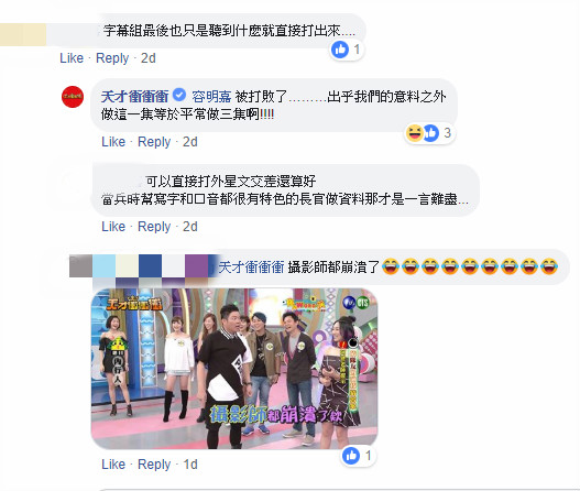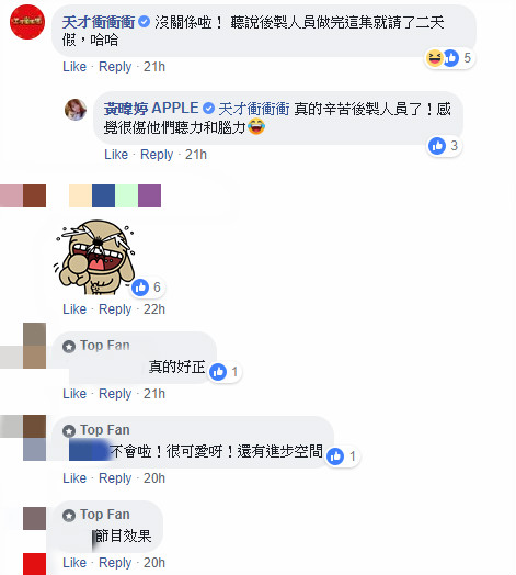 網友們看了笑翻:「字幕組最後也只是聽到什麼就直接打出來…」,節目的小編逗趣說「被打敗了…出乎我們的意料之外,做這一集等於平常做三集啊!」甚至還回覆Apple:「沒關係啦!聽說後製人員做完這集就請了三天假,哈哈!」不過節目的笑果滿分,讓許多網友笑到肚子痛。