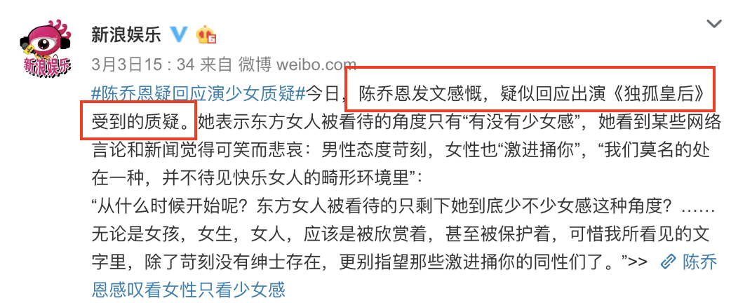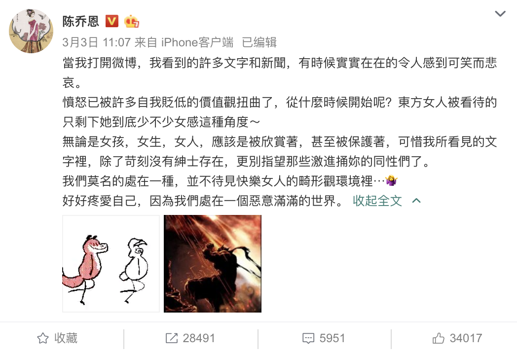 陳喬恩在昨日中午時發文寫下:「當我打開微博,我看到的許多文字和新聞,有時候實實在在的令人感到可笑而悲哀。憤怒已被許多自我貶低的價值觀扭曲了,從什麼時候開始呢?東方女人被看待的只剩下她到底少不少女感這種角度~」,並提到要好好疼愛自己,因為我們處在一個惡意滿滿的世界,語句中傳遞出滿滿的無奈與不解。