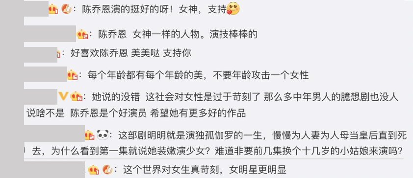 然而根據陸媒報導,傳出是因為有網友認為她已經39歲,卻在劇中飾演少女一角,相當不適合。而看見陳喬恩本人發文抒發後,許多網友替她打抱不平,說道:「每個年齡都有每個年齡的美,不要年齡攻擊一個女性」、「好喜歡陳喬恩 支持你」、「這個世界對女生真苛刻,女明星更明顯」、「我覺得她很好啊」,粉絲們也紛紛替她加油打氣。