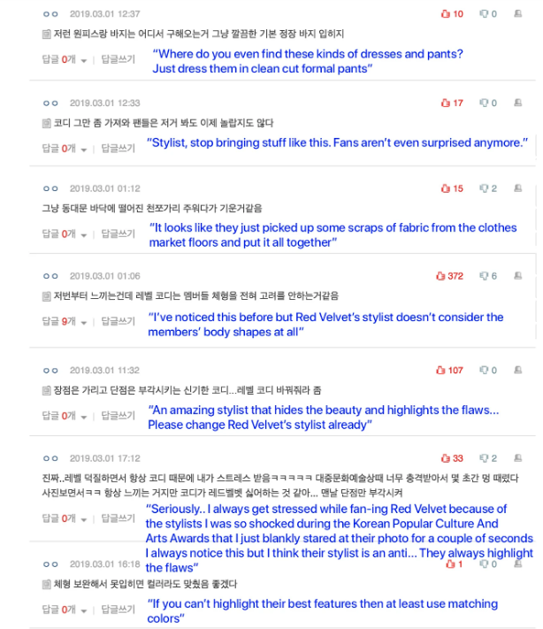 網友留言「是在哪裡找到這些衣服褲子的?」、「別再讓粉絲看到這些無聊的東西了」、「竟然把好的部分都遮住,反而把不好的地方都露出來」、「趕快換掉Red Velvet的造型師!」、「不能襯托美麗至少搭配同色系很難嗎」,也有人指出這次的服裝有三大問題,分別是太像老女人、太沒品味、露太多等,Red Velvet這次的造型可說是讓網友相當不滿。