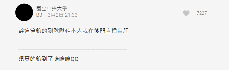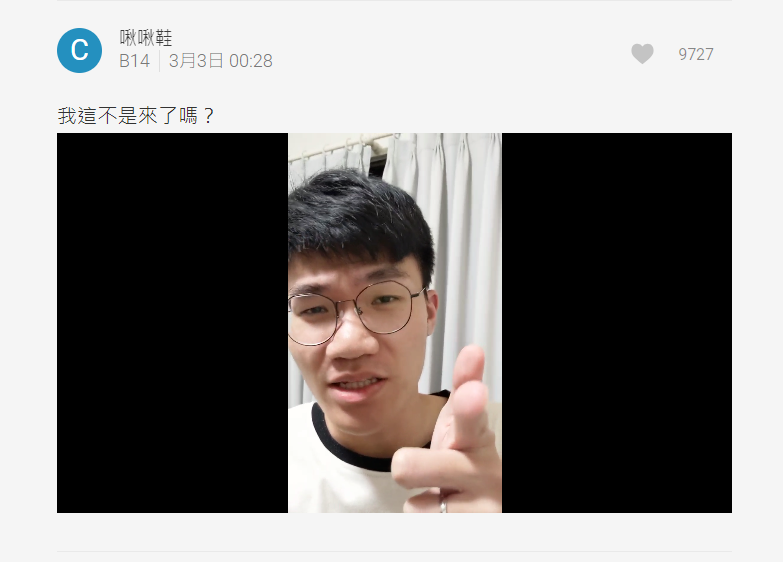 但是事情出乎版上網友的預料,啾啾鞋本人真的親自拍攝7秒短片回應留言,啾啾鞋在短片中說「要我證明自己是不是啾啾鞋?我這不是來了嗎?B3,肛門洗乾淨一點阿!」,影片一出也瞬間在DCARD上引爆話題,啾啾鞋上傳短片的留言超過9500位網友按讚,留言的B3網友也獲得7070位網友的按讚,B3也更新留言表示「還真的釣到了嗚嗚嗚QQ」。