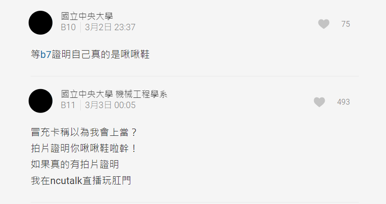 啾啾鞋是國立中央大學化學系的校友,結婚消息一出在DCARD中央大學版也有網友PO文分享心情,在PO文留言中有許多網友也送上祝福,但是有一位網友在B3留下「這篇釣的到啾啾鞋本人我在後門直播自肛」的留言,沒想到卡稱啾啾鞋的網友竟然真的出現在B7回應,表示「肛門洗乾淨啊!」,讓原本留言的網友大驚,在PO文底下再次放話「冒充卡稱以為我會上當?拍片證明你啾啾鞋啦!如果真的有拍片證明,我在ncutalk直播玩肛門」。