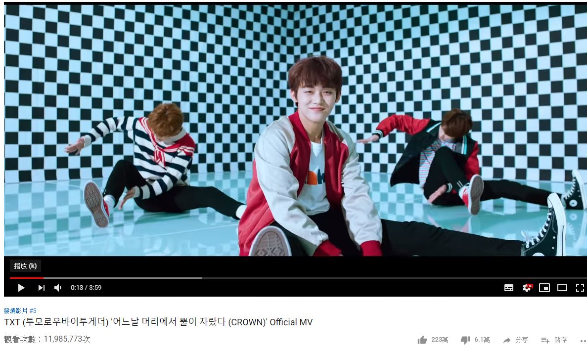 韓國經紀公司BigHit娛樂時隔5年繼大勢男團BTS之後再推出師弟團TXT,1月5成員各自亮相後,4日,終於在電視台Mnet的出道特輯節目亮相,今日則將舉行出道Showcase。昨日晚間6時,新歌《Crown》的MV一上傳YouTube不到13小時已經突破千萬點閱,事實上,TXT一出道備受關注的程度,全都反映在專輯銷售量和主打歌在網路上的熱度,創下不少新人團的紀錄。