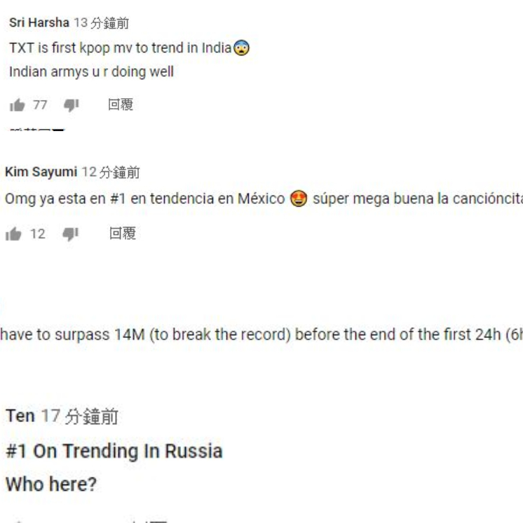 TXT一出道的熱度驚人,其中從主打歌《Crown》MV一上架到YouTube頻道至今不到18小時已經有超過1,100萬的觀看次數,目前也名列台灣發燒影片第5名。而全球網友也在MV底下大批留言,不斷更新TXT在各國網路上的討論度,並紛紛說到「TXT是印度第一個登上發燒的韓團MV」另也有墨西哥、俄國網友出面表示TXT登上該國熱搜,更有粉絲應援「如果在今天晚上6點前超過1400萬就能超越ITZY」。