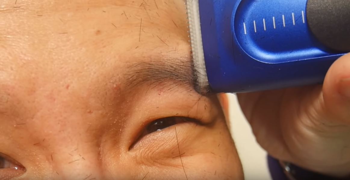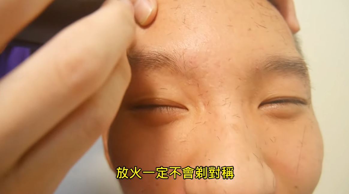 剃完光頭後,便進入了影片的重頭戲——剃眉毛,由「放火」親自操刀,剃掉「小玉」的半邊眉毛,沒想到「放火」卻失手將其中一邊的眉毛剃得超光,兩邊眉毛也不對稱,讓「小玉」崩潰大喊「我要剃掉你的,太醜了吧」。