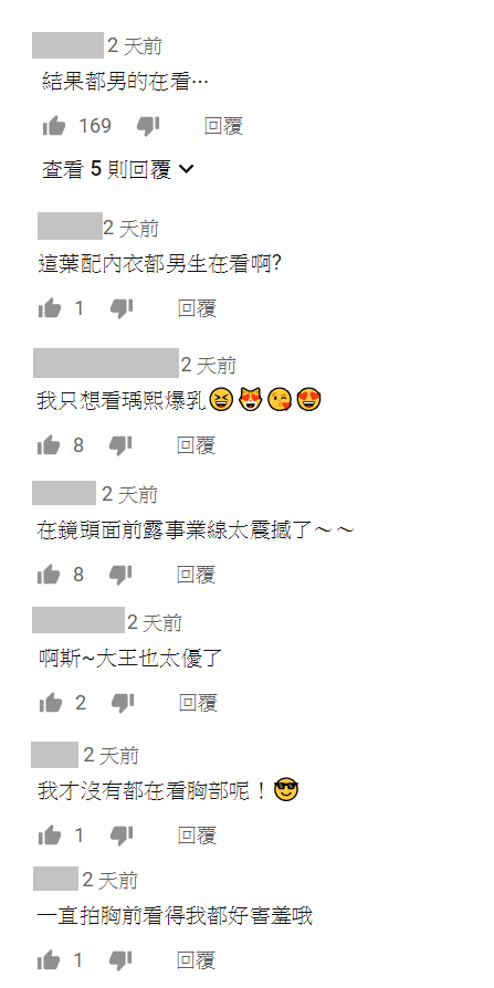 儘管,這次的影片「瑀熙」主要是想要介紹「平價內衣」給廣大的女性朋友們,但影片一出卻意外地吸引了許多男網友前往觀看,更有人直言「結果都男的在看⋯」「這葉配(業配)內衣都男生在看啊?」,而網友們對於此支影片也紛紛發表了自己的看法「我只想看瑀熙爆乳」「在鏡頭面前露事業線太震撼了~~」「一直拍胸前看得我都好害羞哦」。