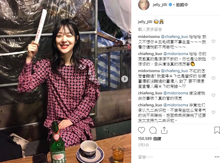 適逢農曆春節,雪莉在個人IG分享吃火鍋照,疑似來到台灣度過新年。當時照片中,雪莉開心高舉筷子鏡頭前方還擺著一罐台灣啤酒,而另一張繁體菜單中也寫著像是基隆排骨酥等字眼,引起大批網友留言「歡迎來台灣」、「來台灣跨年了」,然而也意外引發兩岸網友筆戰,直呼「難道不是中國台灣」。