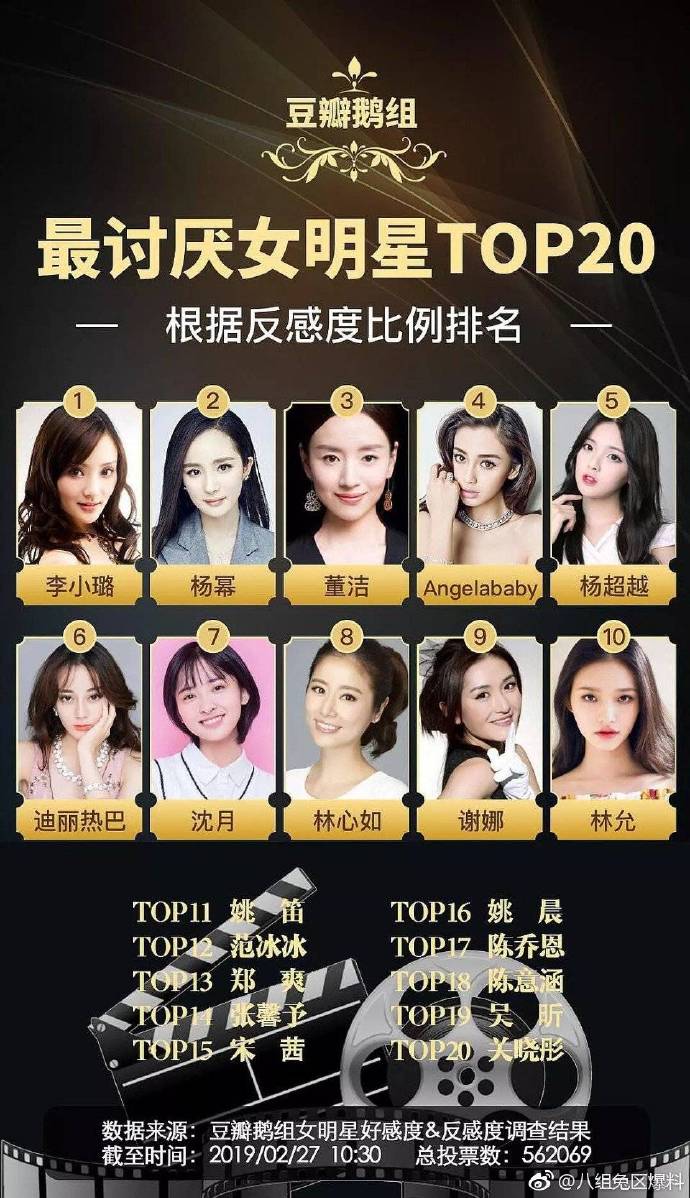 每每大陸都會製作許多投票,並做成排行榜,近日大陸知名論壇「豆瓣」就釋出一系列榜單,包含:最喜歡與最討厭的女明星、最喜歡與最討厭的男明星排行,其中「最討厭女明星TOP20」排行榜一出,也引發網友們熱議。