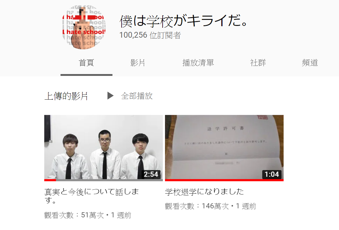 近年來YouTuber成為一種新興職業,網路上也誕生許多網路紅人透過分享影片造成網友話題,更讓如今有許多人把YouTuber視為將來的職業選擇,不僅只是在台灣,日本近年也有許多網友嘗試做YouTuber,期待有一天自己能拍片爆紅,最近就有一組日本高中生3人,組成校園系YouTuber,頻道名稱取為「我討厭學校」(僕は学校がキライだ),透過上傳在學校拍攝的各種搞怪影片,迅速在網路上爆紅,訂閱人數突破10萬,不過如今他們也因為自己在學校的行為嘗到苦果。