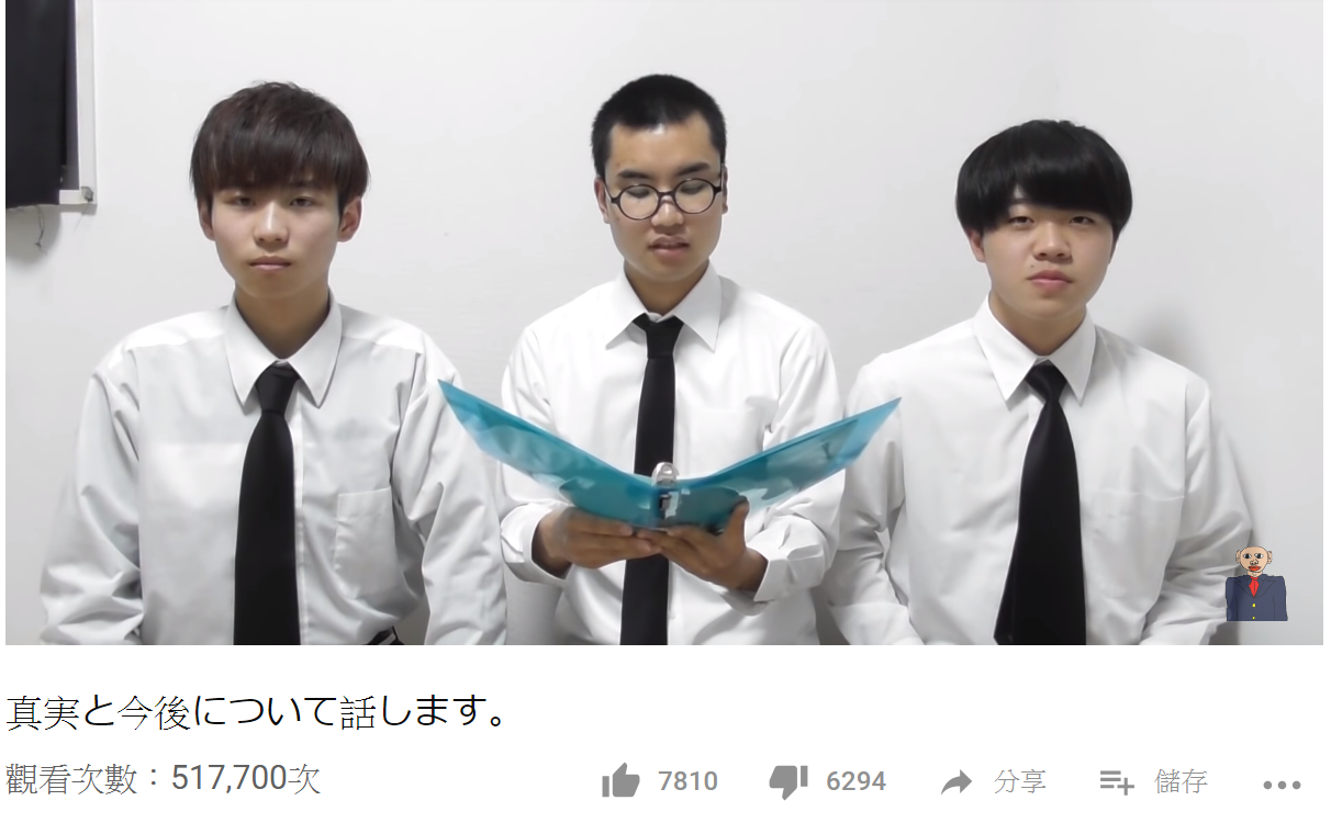 事隔幾天後三人共同現身於YouTube影片,這次則是三人輪流發表聲明並向社會大眾致上歉意,在影片中三人也表示對於造成風波非常抱歉數次鞠躬道歉,而在上課挑戰剃光頭的學生也表示此刻退出團體,另一位遭到退學處分的學生則表示自己的退學與頻道毫無關聯,而頻道也會藉此暫停一段時間,不過身為頻道經紀人的學生則表示頻道在未來絕對會再復出,希望大家能繼續給予它們支持。