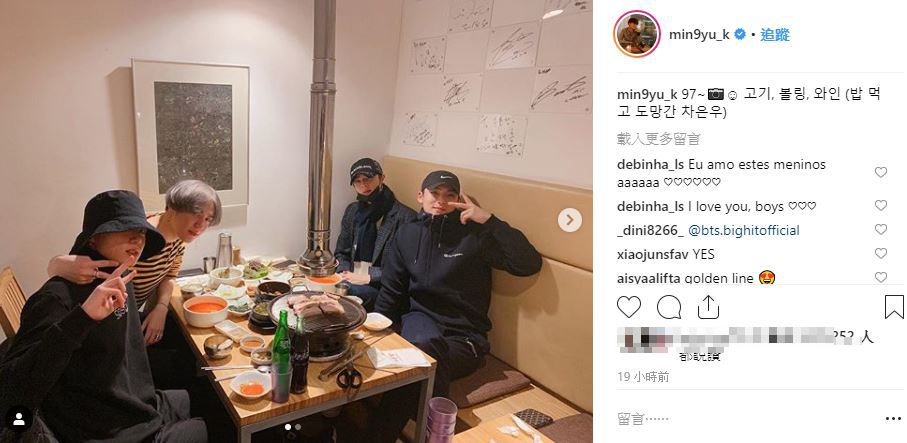 5日,珉奎透過個人IG曬出和車銀優、柾國和有謙聚餐的合照,也行文說到「97~烤肉、保齡球、紅酒。」更特別提及車銀優「吃飽飯就走」。照片中,97 line成員現身不少韓國藝人的愛店吃烤牛腸,除了有謙穿著單薄的條紋上衣外,其他3人包括柾國、珉奎和車銀優都包裹緊實,頭上更戴著帽子帥臉幾乎都被遮住,不過不少網友看到男神聚餐畫面仍忍不住直呼「果然帥哥都在一起玩」、「97line終於同框」、「畫面好溫馨啊」。