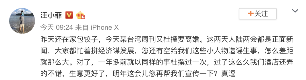 根據台灣媒體《ETtoday》的報導提到:「根據親近的友人透露,夫妻2人多次為錢起爭執,一氣起來大S甚至動了離婚念頭」,並提到兩人常意見分歧,兩人生活的地點也不相同,因而常產生口角衝突。面對離婚一說,汪小菲在今日上午9點多時,寫下:「昨天還在家包餃子,今天某台灣週刊又杜撰要離婚。這兩天大陸兩會都是正面新聞,大家都忙著拼經濟謀發展,您還有空給我們這些小人物造謠生事,怎麼差距就那麼大。」,直接否認離婚傳言。