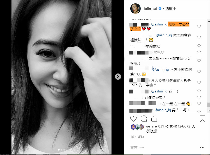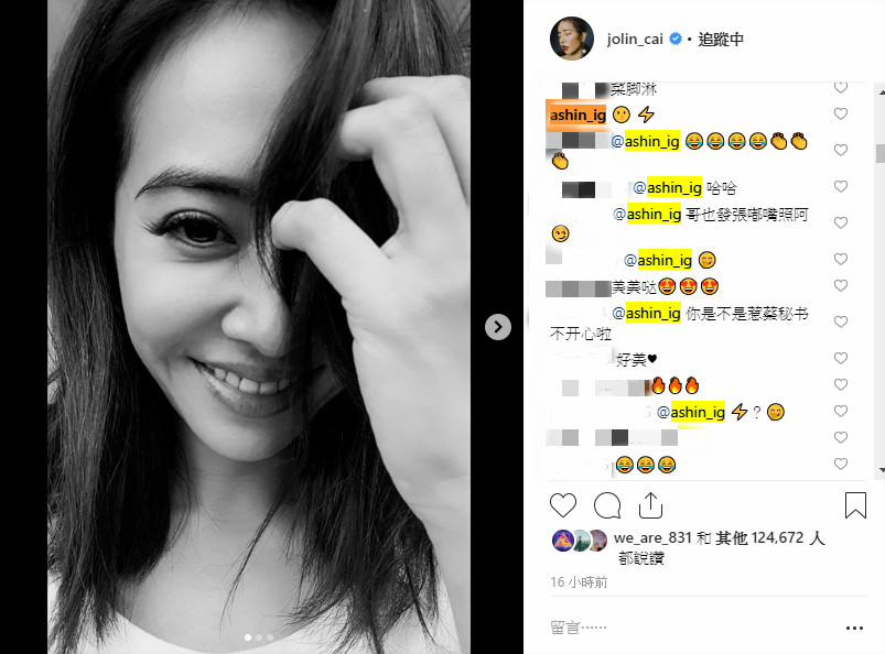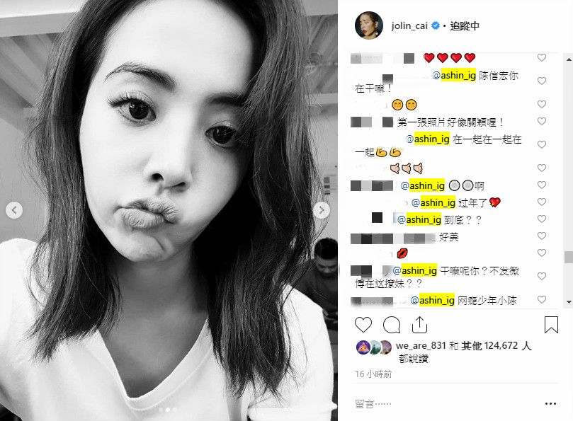 而昨天晚上,蔡依林在IG曬出幾張黑白色調的自拍照,只見蔡依林俏皮地用頭髮和手遮住半邊臉,面露嬌羞神情,接著又對著鏡頭做出搞怪的嘟嘴表情。不過有眼尖的網友發現,阿信本人現身在底下留言,還曖昧留下「親嘴+閃電」的符號,讓網友們看了瞬間暴動。