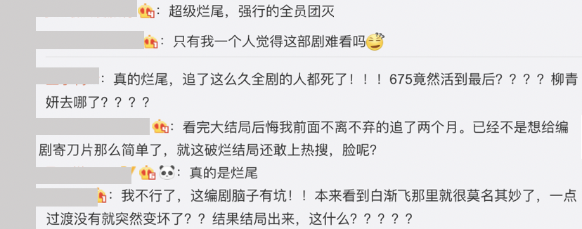 好人都死光光,劇中壞事做盡的柳青蕪卻活了下來,成為皇妃,超灑狗血又神逆轉的劇情讓觀眾們看傻了眼,紛紛怒轟:「第一次看到配角團滅的」、「這編劇腦子有坑!」、「只有我一個人覺得這部劇難看嗎」、「挖坑不填坑,結局好爛」、「這部劇應該改名叫不是主角的都得死。」、「不得不說,一直都很好,結局爛尾了」。