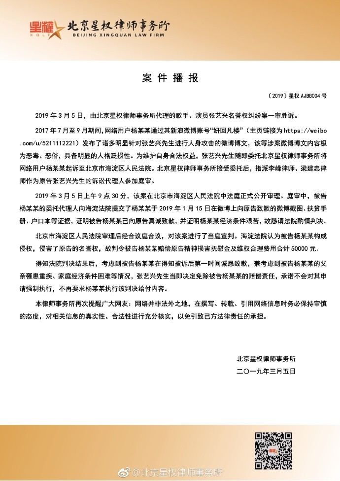 根據法院公布的審判內容來看,被告曾在個人微博上散布低俗咒罵、不實的言論,包含「張藝興今晚暴斃死在街頭」等等的激進言論,使得張藝興的形象遭到嚴重貶損,工作室憤而提告後,在昨日法院宣布被告須支付張藝興25萬人民幣的賠償(約台幣114萬元)。然而被告日前已經發佈了誠懇的致歉貼文,張藝興考慮到他家庭經濟困難的實際情況,決定不要求被告支付精神賠償。