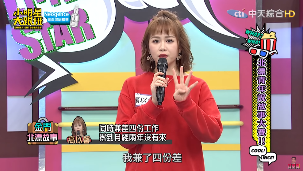 身為金門人的高以馨,一上了大學她就搬出家裡,家裡也不再負擔她任何生活費用,全靠她一個人在台北打拚。大學念建築設計的她,課業已經非常忙碌,但為了要支付生活支出,她一個人兼了4份工作,「拍網拍、家教、補習班輔導老師、工地畫圖」,辛苦工作就為了要能養活自己。