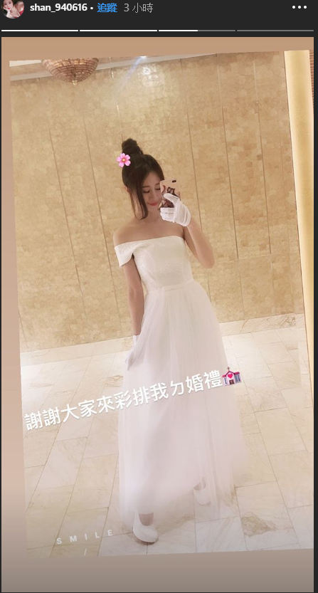 汪選璇今天下午突然在IG限時動態曬出婚紗照,只見她穿著一身平口白紗,頭髮盤成包頭,手上戴著新娘白手套,腳上還踩著一雙純白的高跟鞋。看上去相當優雅氣質。她在照片上寫著「謝謝大家來彩排我的婚禮」,如此曖昧的一句話,讓不少網友們看了開始猜測。