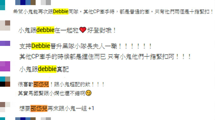 網友們看了紛紛說:「小鬼跟Debbie在一起啦!好登對喔」、「小鬼和Debbie很配欸」、「希望小鬼能再次跟Debbie同隊。其他CP牽手時,都是普通的牽。只有他們兩個是十指緊扣!」、「Debbie是小鬼的幸運兒~」、「邵岱兒跟小鬼超配的欸!」、「支持Debbie晉升黑隊小隊長夫人一職」。