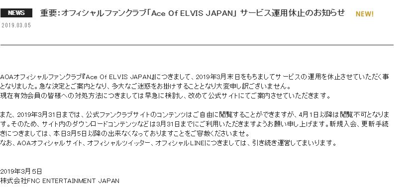 5日,女團AOA所屬經紀公司FNC娛樂突然在日本官方網站以「重要通知」發布消息,內文表示3月底官方Fan Club 「Ace Of ELVIS JAPAN」將停止營運,並進一步解釋網也留功能只到這個月31日,並在4月1日關閉網站。而針對站內會員,官方也表示5日開始,會員招募和會員資料更新都將停止。