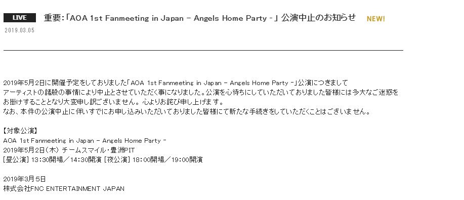此外,AOA原定5月2日於東京豐州舉行的兩場見面會「AOA 1st Fanmeeting in Japan『Angels Home Party』」也確定取消。針對見面會臨時喊卡,經紀公司則解釋是因為成員的一些狀況而被迫終止演出,並對粉絲感到十分抱歉。不過也澄清AOA除日本外的官方網站、Twitter和LINE仍持續營運中。