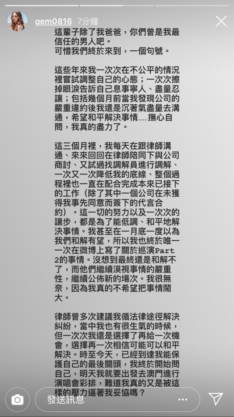 鄧紫棋痛心寫下:「這些年來我一次次在不公平的狀況裡嘗試調整自己的心態;一次次擦掉眼淚告訴自己息事寧人...」,並提到公司一再的漠視事情的嚴重性,仍繼續宣布巡迴演唱會的場次,但鄧紫棋因為不想讓歌迷失望,決議未來兩個月內的八場演唱會依然繼續進行。最後鄧紫棋也提到:「我在漫長的商討過程中真的感到絕望了」,語氣傳遞出滿滿的無奈與沉痛。