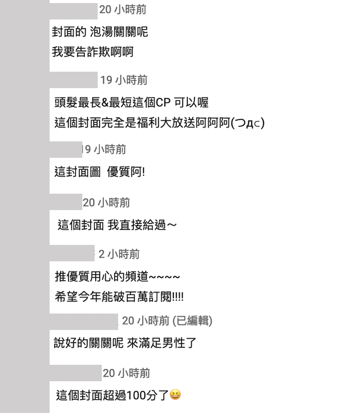 這次的影片截圖選用關關泡湯的背影照也讓網友紛紛留言,表示:「封面騙我」、「這個封面超過100分了」、「天阿這封面香氣四溢阿,信我關的教徒站出來~」、「封面的泡湯關關呢?我要告詐欺啊」、「可惡,被封面騙進來 」、「說好的泡湯畫面呢? 男粉福利呢?」,引發網友們暴動。