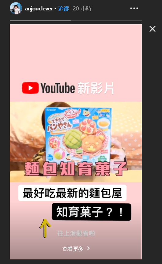 影片開始安啾先向粉絲說明一陣子未上片的原因,是由於最近她打算從日本搬回台灣,準備一些搬家的手續及處理因此才比較忙碌,表示自己快要忘記當YouTuber的感覺,而宣告回歸的安啾這次也要從她最拿手的主題「知育菓子」開始,這次她要介紹的是新款的「麵包知育菓子」,如今日文能力也提升的安啾看到自己過去亂說日文的畫面,更是直說自己當時不要臉,不過她也表示說「每個人都會有黑歷史」。