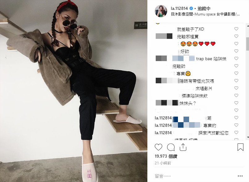 不過蕾菈的腳上卻穿著一雙汽車旅館的室內拖鞋,讓網友們紛紛歪樓直說:「請問鞋子奪cool」、「少個Vans」、「煞氣a拖鞋」、「拖鞋太搶戲了」、「拖鞋很炫」、「這個拖鞋我覺得毀了氣氛」、「這鞋我可以!」還有網友逗趣問「拖鞋哪裡買?」蕾菈也俏皮說:「探索汽旅歡迎您」。