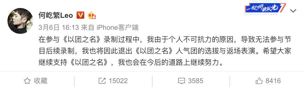 但在6日時,何屹繁在微博上發文:「在參與《以團之名》錄制過程中,我由於個人不可抗力的原因,導致無法參與節目後續錄制,我也將因此退出《以團之名》人氣團的選拔與返場表演。」,粉絲們也紛紛留言:「是以團不配」、「不過這渣節目,走了也許會更好」、「節目賽制不好、「退出好 這節目太坑」、「這個賽制就本身就有問題,他將各個有實力的選手分為隊長。後面應該重新組隊」,賽制再度引發粉絲討論。