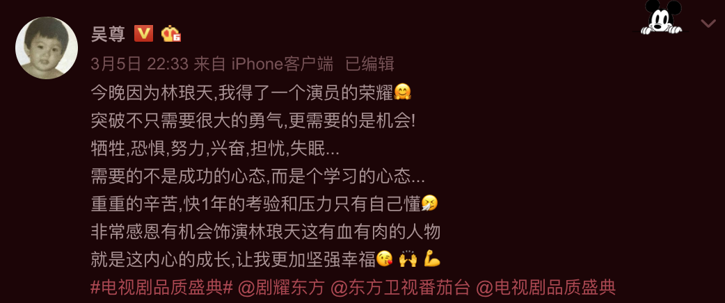 吳尊發文寫道「今晚因為林琅天,我得了一個演員的榮耀,突破不只需要很大的勇氣,更需要的是機會!犧牲、恐懼、努力、興奮、擔憂、失眠」他強調「需要的不是成功的心態,而是個學習的心態...」並且坦言「重重的辛苦,快1年的考驗和壓力只有自己懂」對於能夠飾演林琅天這個角色,他也感到非常感恩,因為這些歷練,使他內心成長,讓他更加堅強幸福。