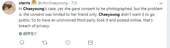 對此,11日,彩瑛直接將該張照片轉貼到TWICE官方IG中,並對外澄清「照片不是我本人上傳的」,引起外界擔心TWICE的隱私權已經備受侵犯。根據網友透露,該張照片雖然是在彩瑛知情的狀況下拍攝的,不過當時該張照片有刻意將隱私權「設定為朋友圈」,然而卻不幸外流,對此,彩瑛除澄清照片不是他上傳的,也進一步呼籲外界「我覺得好可怕,大家不要這麼做」。