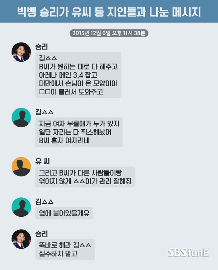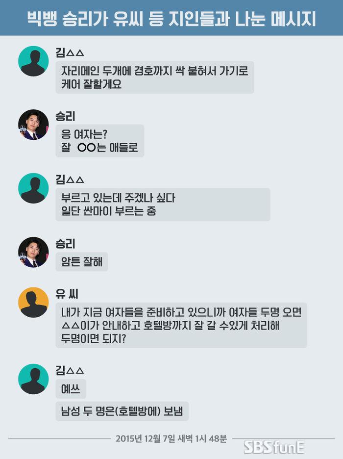 上月26日,根據韓媒《SBS fun E》爆料,一則有關勝利和酒吧高層透過通訊軟體「kakaotalk」的對話曝光。聊天成員共8人包括勝利、2名男歌手、合夥投資人2位、演藝企劃公司員工和2名圈外人,內容顯示勝利疑似為海外投資者提供「叫小姐」的服務,消息一出引起外界撻伐,目前正以嫌疑人身分接受調查。