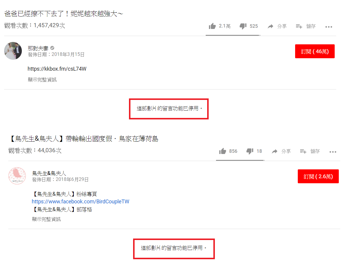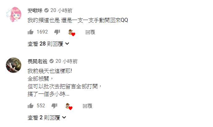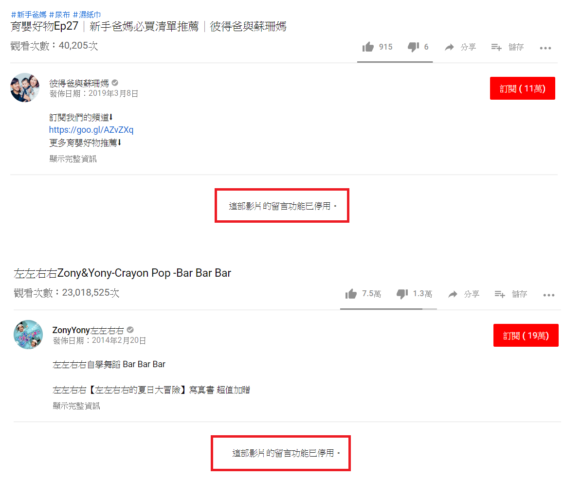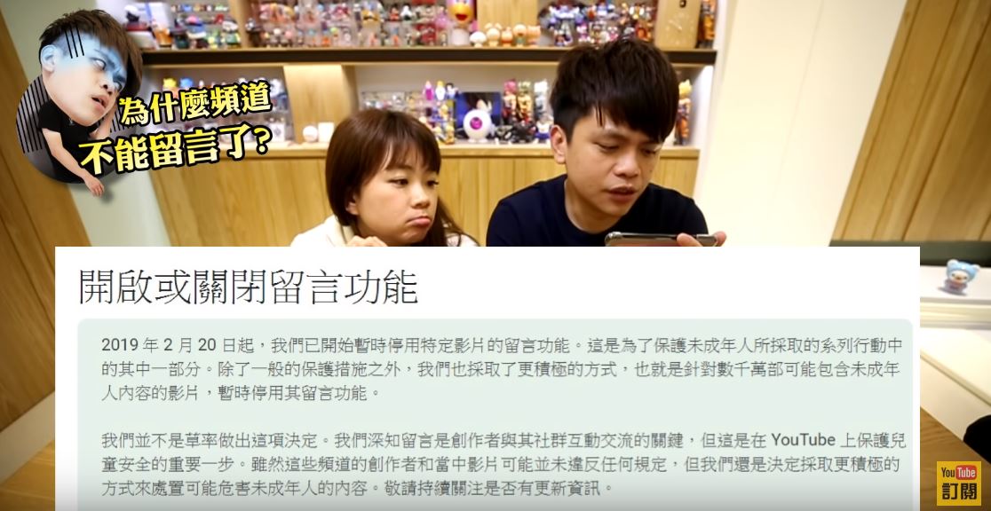 然而,此項政策受到影響的「Youtuber的受災戶」不計其數,還有許多Youtuber也現身留言,而瀏覽一些知名的「親子Youtuber」,如「彼得爸與蘇珊媽」、「左左右右」、「那對夫妻」等等,他們頻道的留言也悉數被關閉。