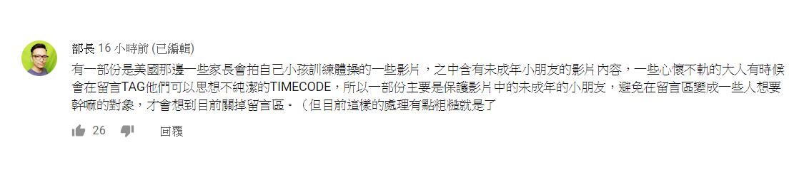 接著,「蔡阿嘎」便以官方所發出的說明,向觀眾解釋了這個「Youtube文字獄」,其最終目的是為了「保護未成年孩童」,因而管控並關閉「留言機制」。而這個政策主要原因是因美國有許多家長會拍攝孩童的影片,卻引來了許多不懷好意,甚至是「戀童癖」的騷擾不雅留言,因此為保護影片中的「未成年」孩童,所以對留言做了限制,而台灣官方也跟進,對影片中有出現「未成年」孩童的頻道,做出「關閉留言」的措施。