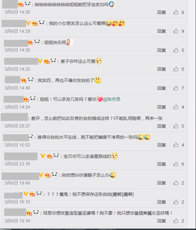 不過滿嘴黑牙的模樣卻嚇壞許多粉絲,紛紛留言:「你是仗著自己好看就可以這樣麼」、「哈哈哈哈哈哈哈哈姐姐能把牙齒變白嗎」、「難得你自拍水準線上,就不能把嘴擦乾淨再拍一張嗎」、「你怎麼回事??不能亂用臉啊」、「你在諧星這條路上是一路不回頭了,再見」、「黑色吸血鬼」,猛虧陳喬恩。