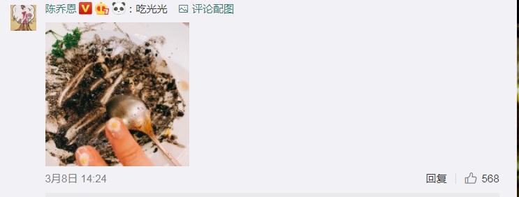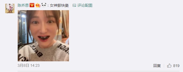 近日,陳喬恩受到時尚大牌邀請,遠赴歐洲出席巴黎時裝周,平常就不忘抽空跟粉絲互動的陳喬恩,在歐洲旅遊時,也不忘跟粉絲們分享自己的近況。只見,陳喬恩在3月8日婦女節當日,貼出一張自己滿口黑牙的自拍,並寫著下「女神節快樂」並且還貼出自己吃完的空盤子寫著「吃光光」相當俏皮可愛。