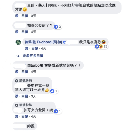 有網友表示自己也是「看不慣各大版上的仇女仇CCR辱罵同性戀的台男,製造對立、謾罵的言論真的非常不好,感謝扣哥大聲嗆出來!建議把這些寫成歌,我絕對第一個買單!」還有許多網友也深感贊同「 真的,很多台男都不知道檢討」、「真的看不懂為什麼自己追不到女生然後就仇女的那種人」、「扣哥猛!」、「看你電人真的豪爽」、「中肯!笑死」雖然也有網友留言表示「扣哥又發病了?」但謝和弦本人卻親自回復留言,表示自己「只是在寫歌」。