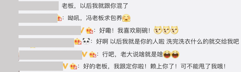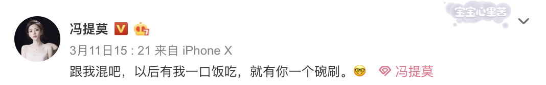 馮提莫昨日在微博上發文寫下:「跟我混吧,以後有我一口飯吃,就有你一個碗刷。」,並附上四張自拍照,面對馮提莫如此霸氣的言論,其他粉絲也紛紛留言歡呼:「馮老闆求包養」、「老闆,以後我就跟你混了」、「好嘞!我喜歡刷碗!」、「好啊 以後我就是你的人啦 洗完洗衣什麼的就交給我吧」、「好的老闆,我跟定你啦!賴上你了!可不能甩了我哦!」。