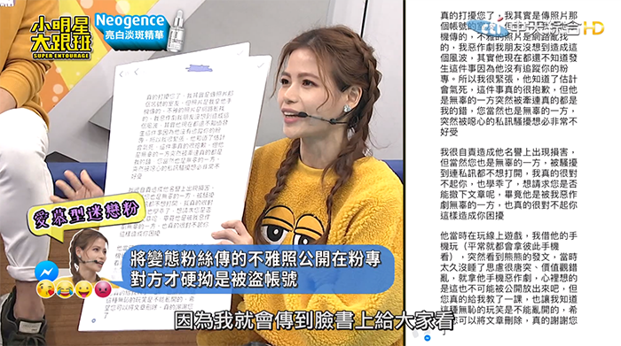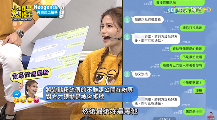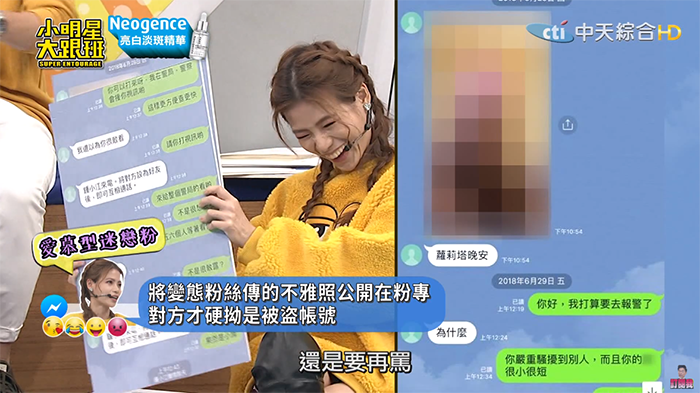 蘿莉塔一開口就抱怨「我一天到晚收到屌照欸!」她透露,先前有人先丟了不雅照,她立刻封鎖對方,結果狂粉不知道到哪拿到她的LINE,竟然又在LINE中丟了生殖器的照片給她。不過蘿莉塔也不是省油的燈,她氣得直說「你好,我打算去報警了」,對方還問「為什麼」,蘿莉塔接著說「你嚴重騷擾到別人,而且你的屌很小很短。」這神回覆也讓現場全笑翻,吳宗憲笑說:「遇到妳算她衰啦~」