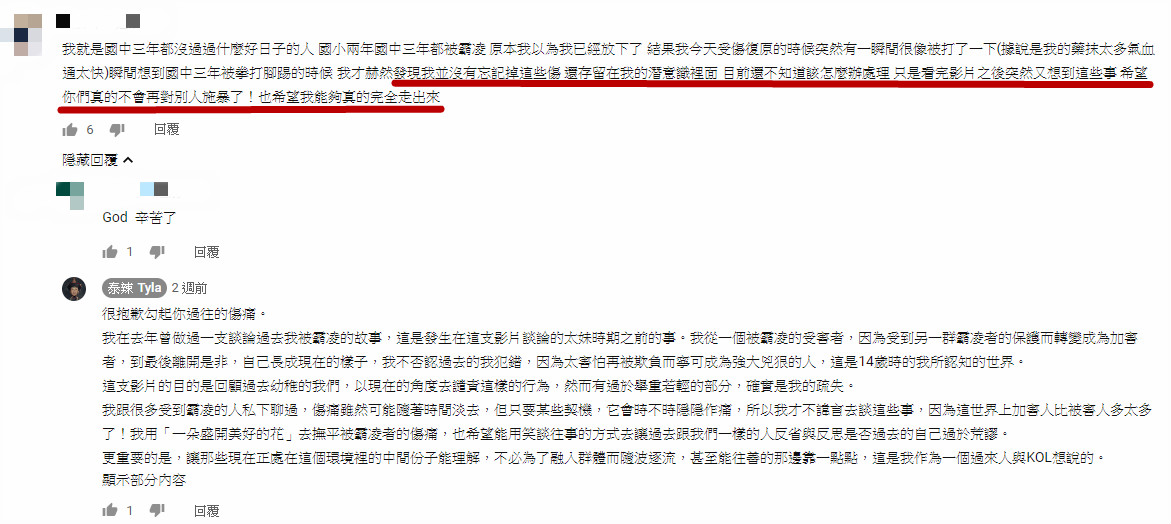YouTuber泰辣(Tyla)和網紅Apple在影片中自爆自己的黑歷史,看起來相當有氣質的Apple過去竟然是讓老師頭痛的太妹,甚至為了一把雨傘就烙人圍堵。不過他們嘻笑著談論這些學生時代的回憶,卻意外勾起許多網友被霸凌的傷痛,事後泰辣也出面道歉,直說自己並非輕率地在談論霸凌,只是覺得自己過去的行為很幼稚,若真的對於某些網友來說感到不悅,是他的疏失。