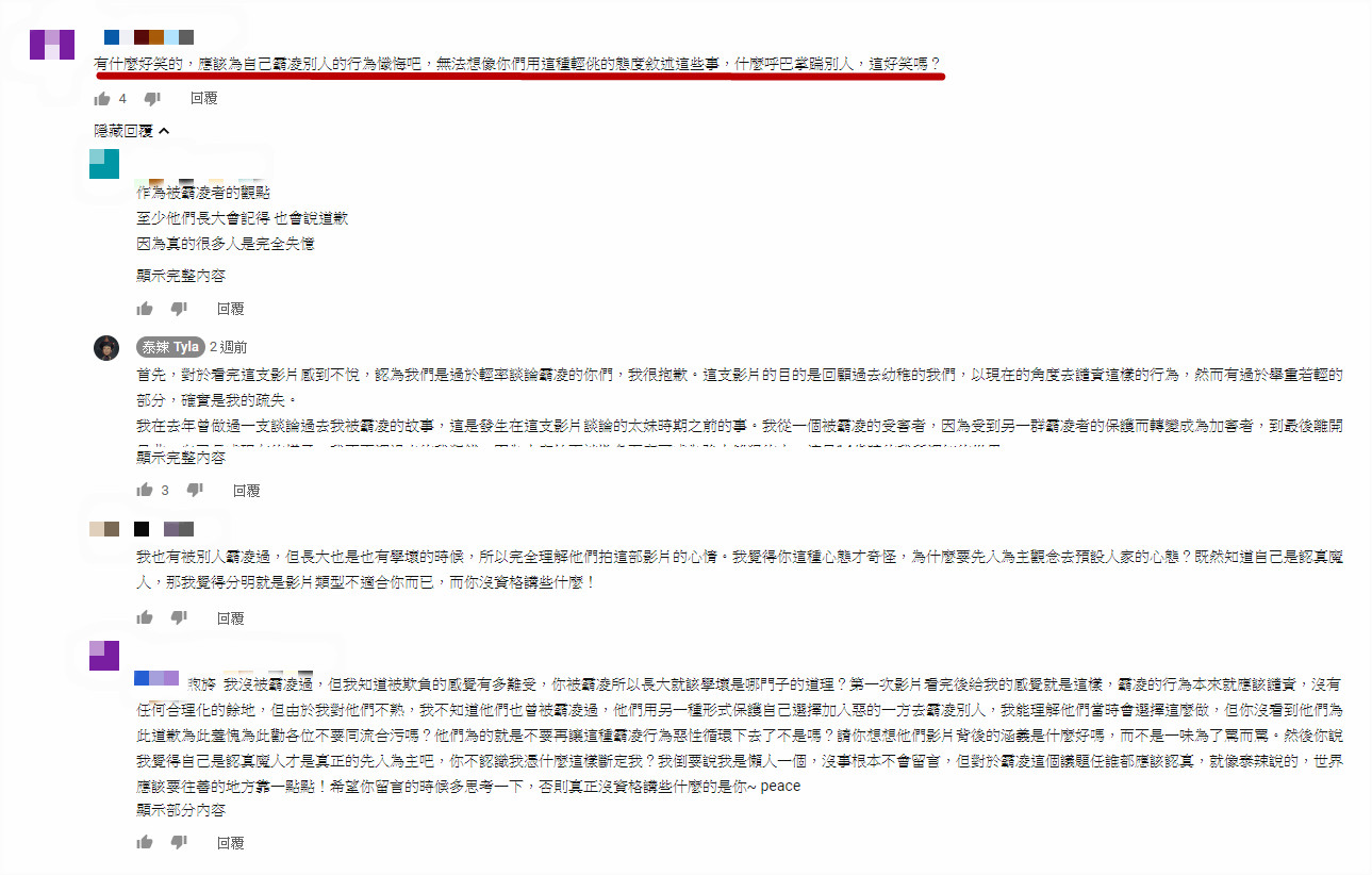 不過這支影片勾起了部分網友不好的回憶,認為當初被霸凌的受害者至今都還留著傷痛,他們卻用嘻嘻哈哈的方式陳述:「應該為自己霸凌別人的行為懺悔吧,無法想像你們用這種輕佻的態度敘述這些事,什麼呼巴掌踹別人,這好笑嗎?」、「想到國中三年被拳打腳踢的時候 ,我才赫然發現我並沒有忘記掉這些傷還存留在我的潛意識裡面,目前還不知道該怎麼辦處理,只是看完影片之後突然又想到這些事,希望你們真的不會再對別人施暴了!也希望我能夠真的完全走出來」、「或許霸凌者現在都是一笑置之覺得只是年幼不懂事 ,可是對被霸凌者來說可能已經造成陰影跟傷害了」。