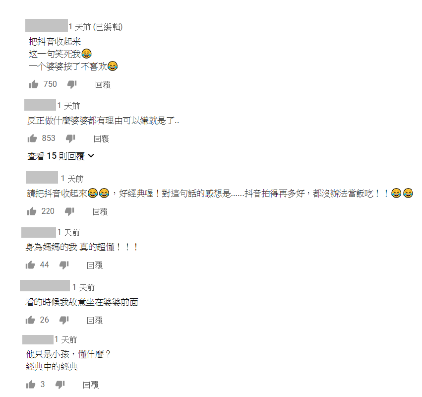 而在此支影片下方,有許多人對於鍾明軒所談論的話題,似乎也都有戚戚焉,紛紛在下方留言:「把抖音收起来,這一句笑死我」「反正做什麼婆婆都有理由可以嫌就是了..」「抖音拍得再多好,都沒辦法當飯吃!!」「身為媽媽的我 真的超懂!!!」,在網上掀起一波討論。