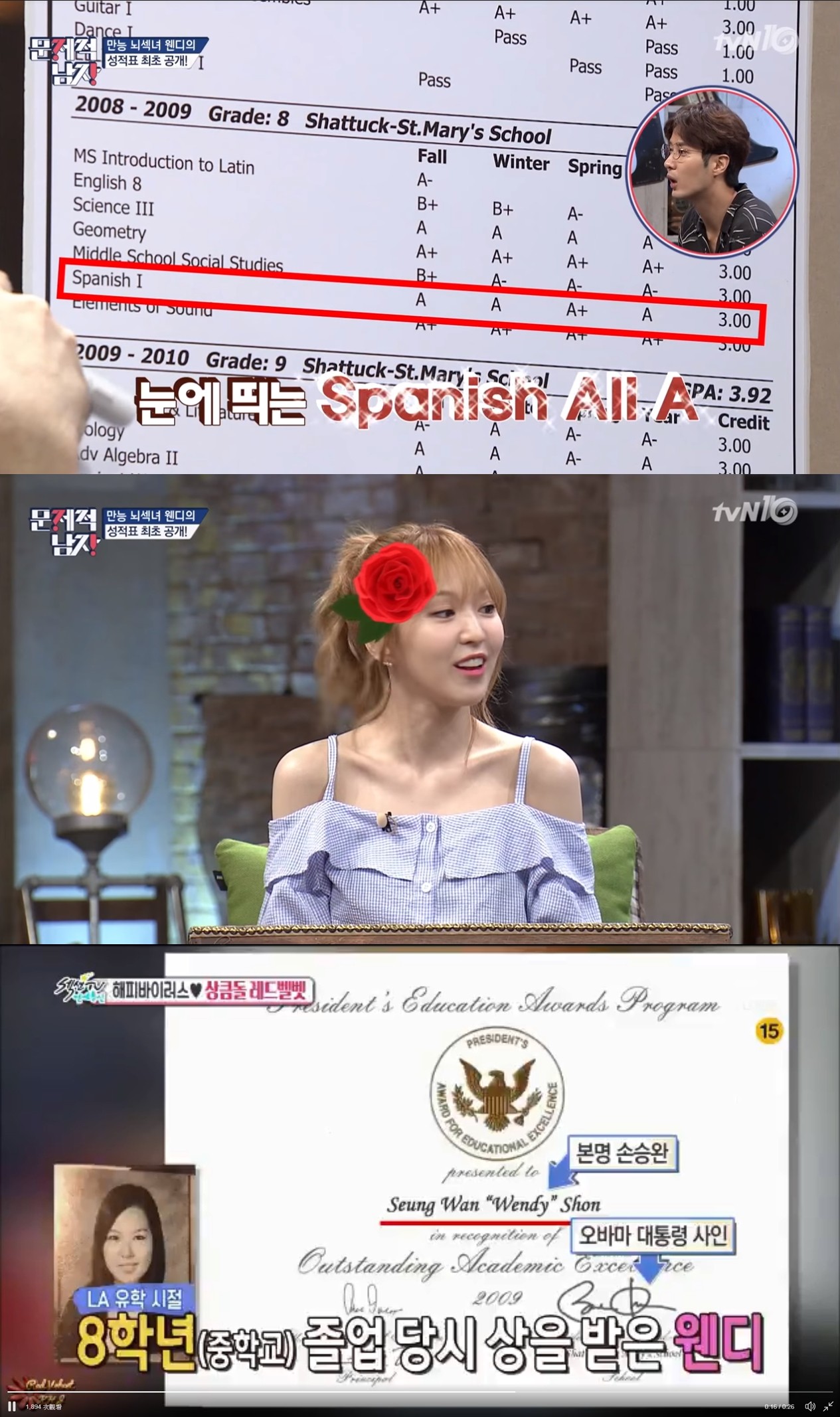 而另一女團Red Velvet的成員Wendy,小學五年級就舉家搬到加拿大,過去也曾在節目《大腦性感時代:問題的男人》中解釋「從小學5年級一直到高三都是國外上學,英語、西班牙文和法語都會一點」。節目中,Wendy一公開成績單,滿滿的「A」顯示學生時代是個名副其實的學霸,甚至曾經拿過美國總統歐巴馬的「總統獎」可見優秀成績並非紙上談兵。