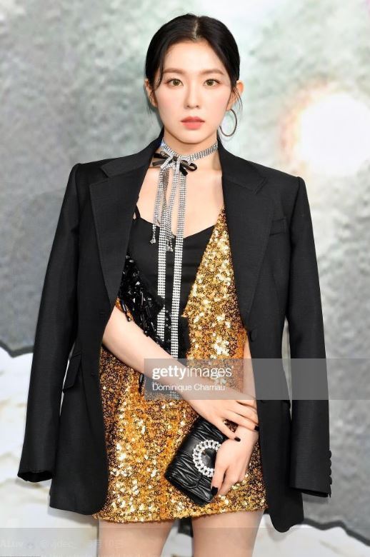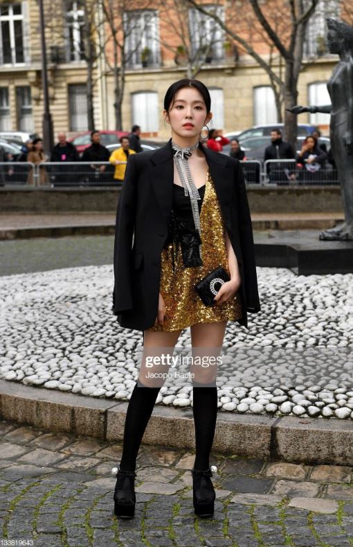 當天現身時裝秀的Irene,單穿品牌MIU MIU的金色短洋裝並外罩黑色西裝外套,不過僅有158公分袖珍身材的他,為了讓身材比例更好,腳下則踩著超高的黑色厚底鞋現身,整體看上去十分有氣質。