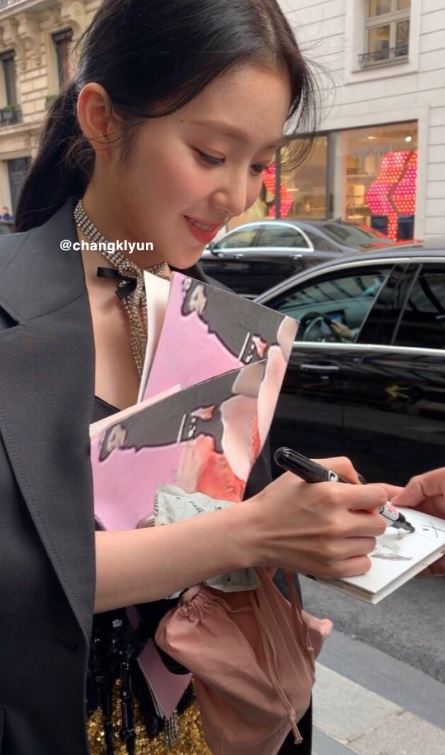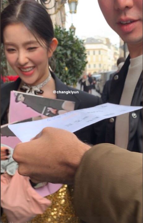 韓國女團Red Velvet成員Irene白皙肌膚和精緻五官不僅是團中門面,更時常在韓國外貌榜單中名列前茅,日前Irene更首度獲邀參與巴黎時裝周,並出席品牌「MIU MIU」的秀場,而Irene的高人氣在法國當地也有粉絲,一支在網路上流傳的影片中,法國粉絲在路上要求Irene替他簽名,而Irene也隨即回頭不僅簽名還寫下該位粉絲的名字,32秒的近距離互動讓網友直呼超級羨慕。