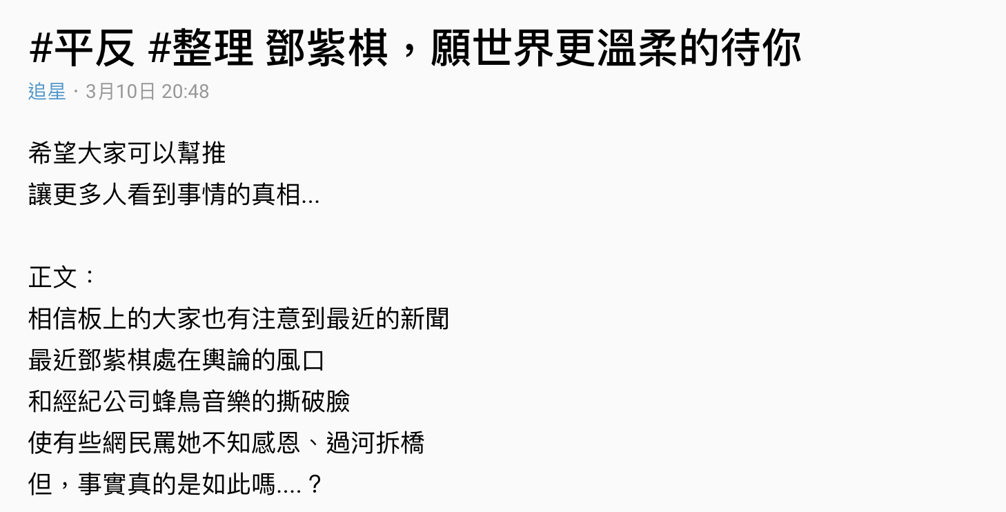 有位網友在Dcard上整理出鄧紫棋和蜂鳥音樂一路上的點滴,並寫下:「相信板上的大家也有注意到最近的新聞,最近鄧紫棋處在輿論的風口,和經紀公司蜂鳥音樂的撕破臉,使有些網民罵她不知感恩、過河拆橋,但,事實真的是如此嗎....?」,在此統整出網友在Dcard中的資料,並歸納出以下四件事件。