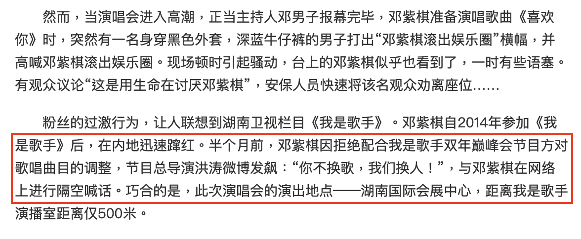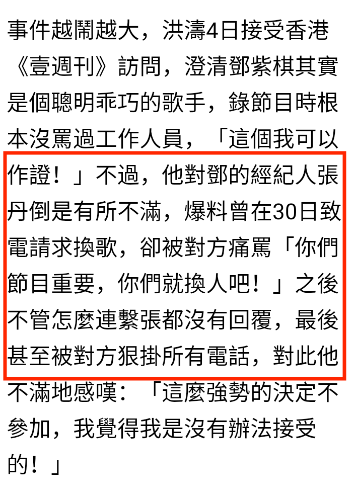 在2014年時,鄧紫棋參加大陸選秀節目《我是歌手2》而爆紅,但許多香港網友認為她忘本、飲水不思源,對她的觀感相當不佳,在當時也傳出鄧紫棋因拒絕調整歌唱曲目,讓節目總導演洪濤微博發飆:「你不換歌,我們換人!」,與鄧紫棋在網絡上進行隔空喊話。事後總導演出面澄清鄧紫棋是個聰明乖巧的歌手,反而是對經紀人張丹(註:蜂鳥音樂的董事)有所不滿。