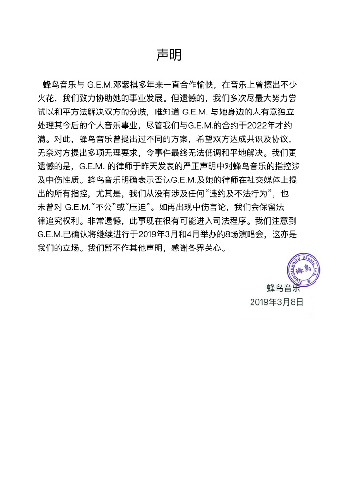 香港天后「鄧紫棋」7號晚間在各大社群平台上發出公告宣布「和蜂鳥音樂正式解約」,此舉卻引來一些粉絲質疑她的作法,蜂鳥音樂也出面發聲明稿寫下:「蜂鳥與G.E.M鄧紫棋多年來一直合作愉快,在音樂上曾擦出不少火花」。近日,在Dcard上有網友整理出鄧紫棋和蜂鳥音樂一路上的點點滴滴,該貼文也吸引了近萬人按愛心。